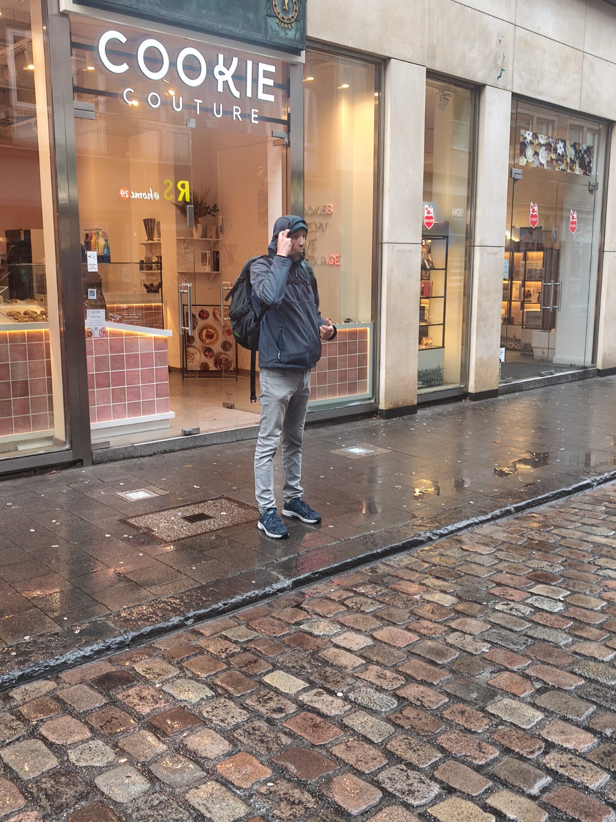 Im Anschluss gingen wir in ein Café. Plötzlich setzte starker Regen ein. Wanderführer Ralf Geerk zog in Erwägung, die Tour wegen des starken Regens abzubrechen und nach Hause zu fahren. Nach etwa 10 Minuten ließ der Regen jedoch nach, sodass wir weiter zur Weltzeituhr gehen konnten.