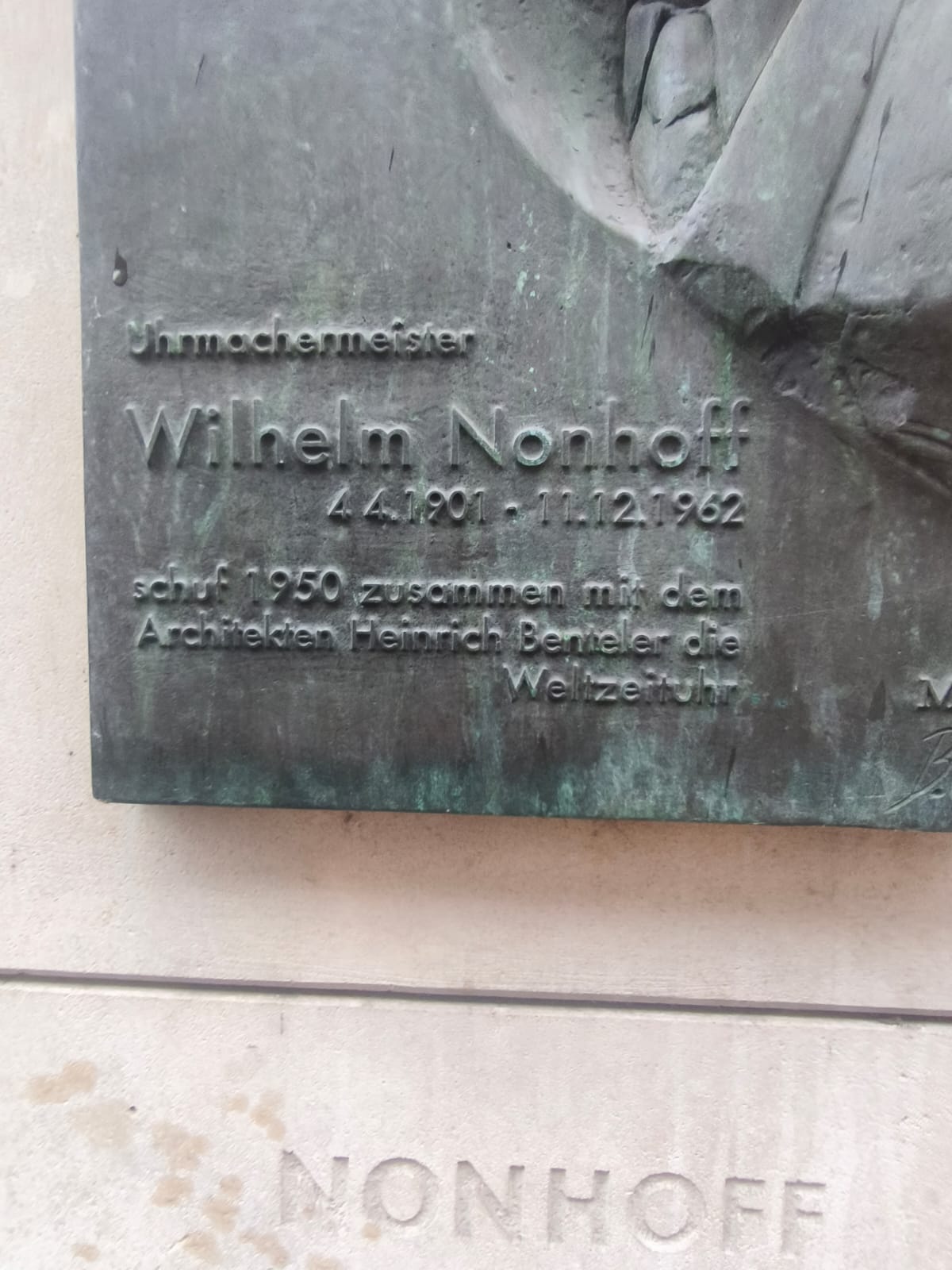 Zur Geschichte der Weltzeituhr: Die Errichtung der Münsteraner Weltzeituhr an der Rothenburg geht auf die Initiative des Uhrmachermeisters Wilhelm Nonhoff zurück. Bei dem Wiederaufbau nach dem Zweiten Weltkrieg wollte er seine mehr als zwanzig Jahre alte Idee verwirklichen, an der Fassade seines Geschäftshauses eine große Außenuhr zu installieren.