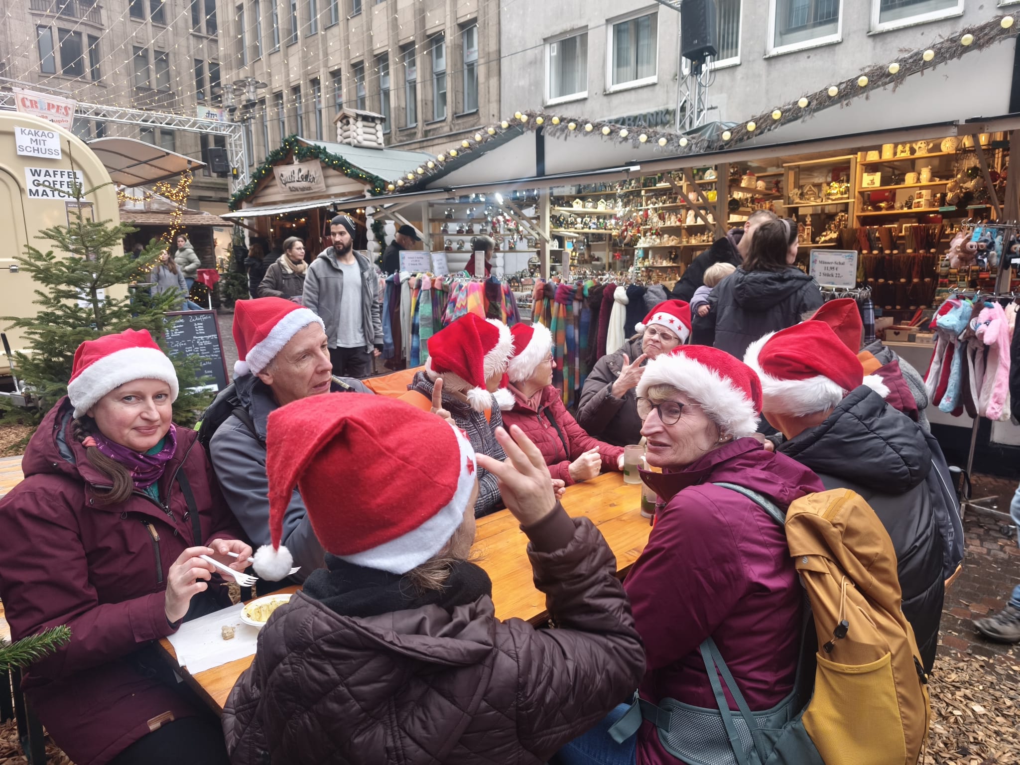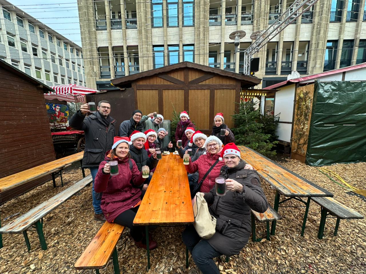 Das finale Ziel unserer Wanderung war der festliche Weihnachtsmarkt in der Innenstadt. Dort ließen wir den Tag bei einem gemeinsamen Glas Glühwein – Prost! – ausklingen. Die Gruppe stärkte sich mit verschiedenen Leckereien vom Markt und genoss bei schönen Gesprächen die vorweihnachtliche Atmosphäre.